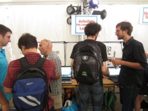 D’un robot en Lego à la réplique de 5M X 2M du Brooklyn Bridge par les Women in Engineering de Concordia, il y en avait de toute sorte pour émerveiller les enfants de 4 à 84 ans. La fin de semaine fut particulièrement propice au rapprochement de la communauté de bidouilleurs attelés à la construction d’imprimantes 3D. Bien sûr, échoFab présentait sa échoRap MK1 en collaboration avec Stéphane de Robotic Sequencing, mais il y avait aussi François de Voxel et François du FouLab avec leurs RepRaps, la PandaBox d’un maker de Toronto. Pour un fana comme moi de l’impression 3D, c’était le temps de comparer nos technologies et d’échanger des trucs, en plus de répondre aux millions de questions de nos visiteurs. Il faut aussi souligner l’apport de Baptiste du LabFab de Rennes (France) avec qui nous partagions une table de démo. Il y présentait des projets à base d’Arduino dont un système de collecte d’informations sur l’utilisation électrique dans