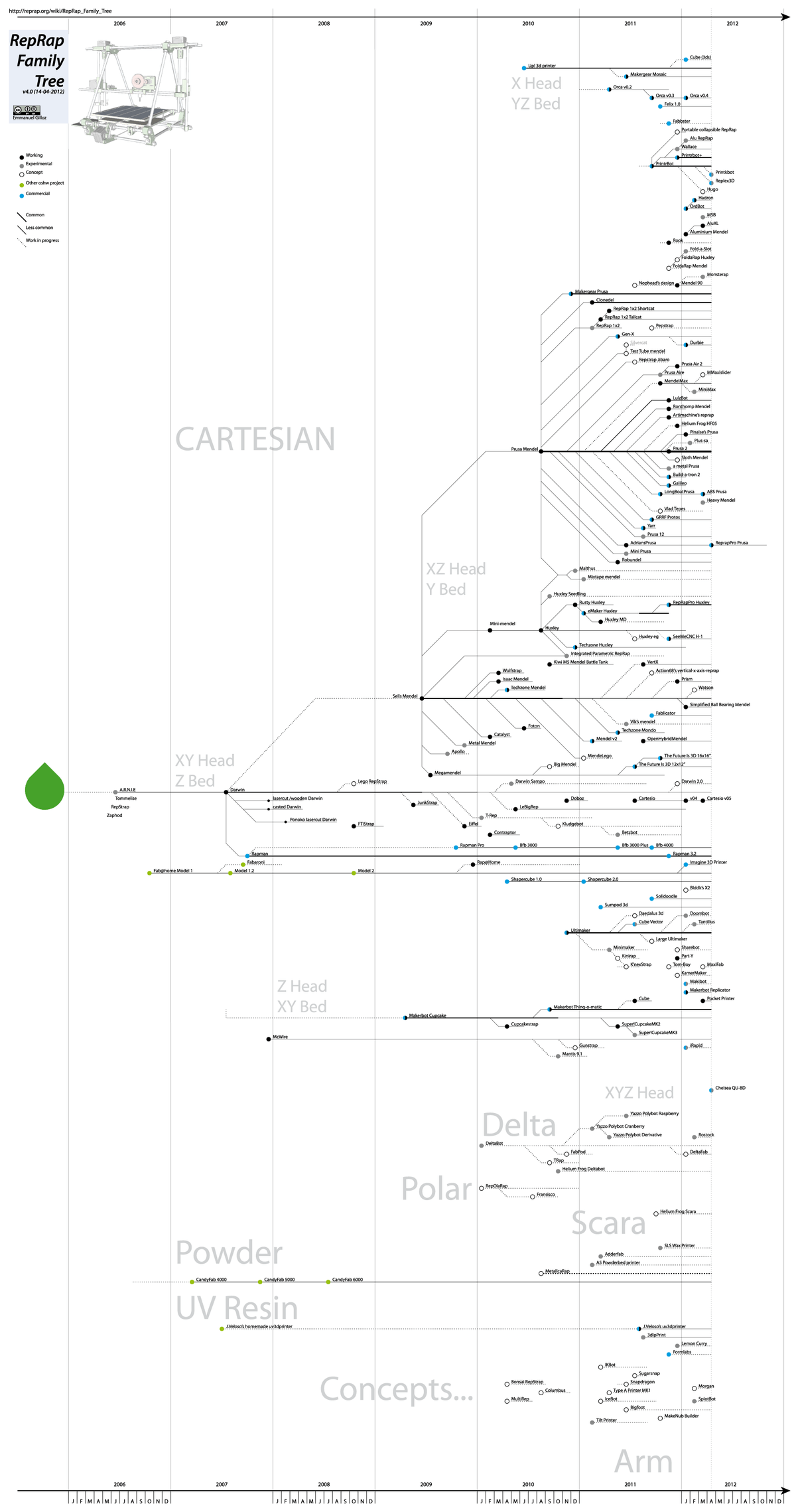 Premièrement, regardons l’évolution exponentielle de l’impression 3D au cours des dernières années. La généalogie du développement du projet RepRap nous donne un bon aperçu de cette évolution (et ne tient pas compte de l’évolution globale de la technologie)