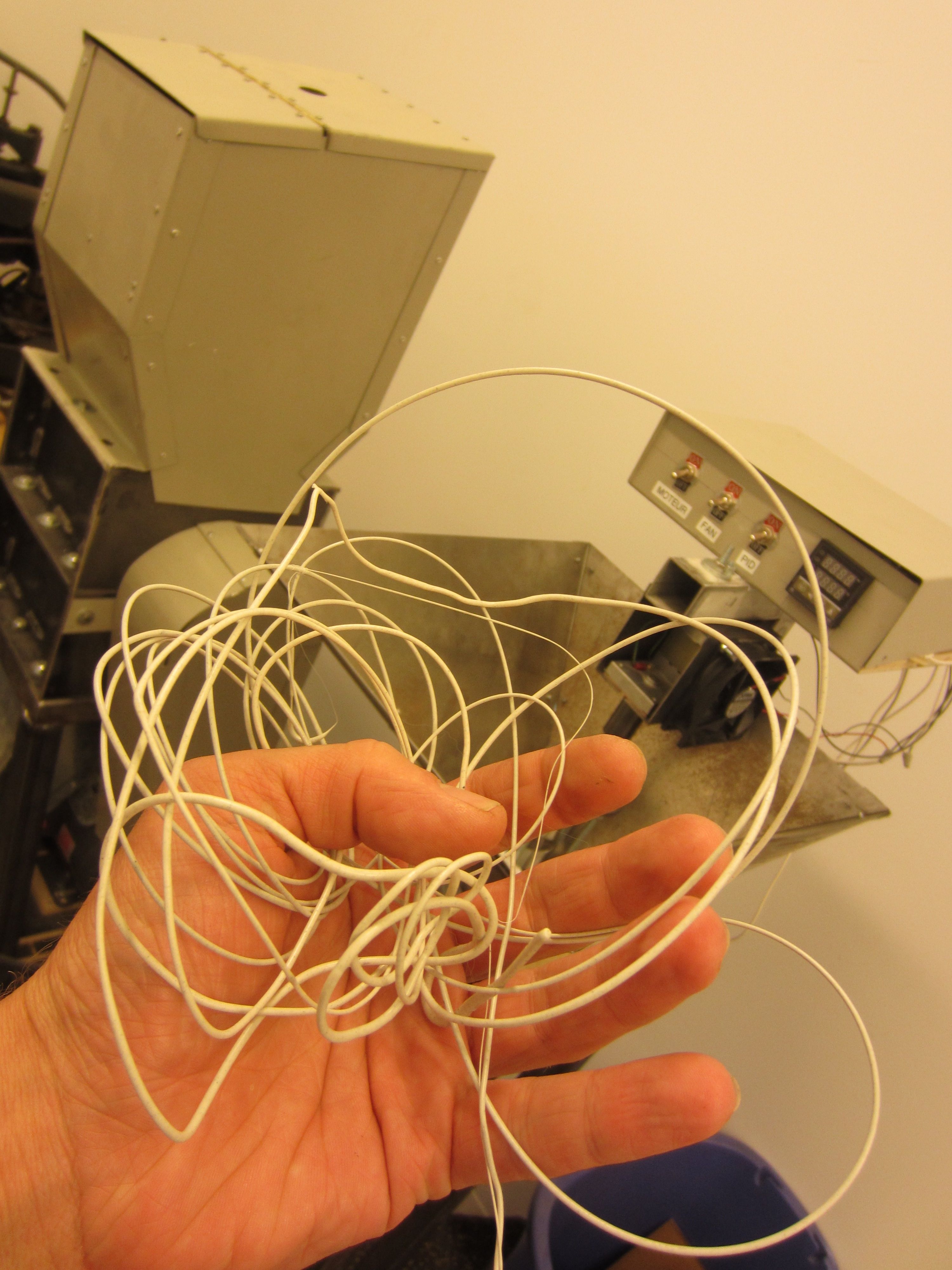Non seulement on peut transformer les pots de margarine et les bouteilles de shampoing en petits chats en plastique, mais on peut aussi transformer les petits chats en plastique…en d’autre chose, je suppose. Samuel est donc venu installer sa machine dans nos locaux et me montrer comment l’utiliser.