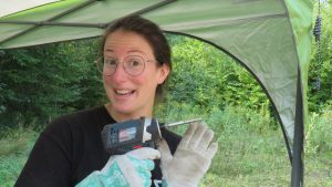 Noémie, poseuse de cache boulons, est aussi en charge de la création de la toile qui doit venir couvrir le zome, même si elle y a travaillé en mode sprint depuis un mois, des membres de l’équipe ont été absents à cause de la Covid et plusieurs autres aléas ont fait que le temps de travail s’est réduit à deux semaines. La toile est faite de grands losanges qui sont cousus du bas vers le haut pour former des bandes diagonales qui doivent à leur tour être cousues ensembles. Au final, ce sont de longues bandes roulées comme un burrito géant compliqué à manipuler! Noémie est malgré tout confiante de terminer le travail et a hâte de revenir installer la toile bientôt.