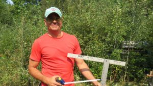 Arrivée mercredi, Annie explique qu’après un bon repas ils se sont mis au travail. Annie a un souvenir gourmand des hot dogs grillés le soir sur le feu, “c’était délicieux même si les patates n’ont jamais cuites!” Pour ouvrir le chantier, après discussion sur l’emplacement du zome, il a fallu d’abord tracer les lignes au sol en utilisant des crayons de bois transformés en mini poteaux pour la cause, ensuite « jacker le zome dans les airs » et commencer la construction des fondations et du plancher. Tout devait être de niveau, c’était un défi tout en sueur et énergie!