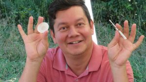 Norberto profite du soleil et aide au nettoyage des pièces imprimées en 3D.