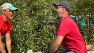 Rino, à droite sur la photo, s’occupe de beaucoup de choses sur le chantier du zome, conception, suivi de chantier, tout ce qui est nécessaire pour que le chantier soit réalisé. Il s’agit de « creuser, percer, visser » sans le faire tout « croche », de gérer les « Cue », de prendre soin des outils, et des doigts… « Ça a été comme je le pensais, une chance nous avons débuté un jour à l’avance pour les fondations car maintenant nous sommes débordés! ».